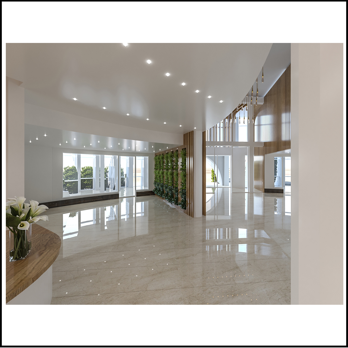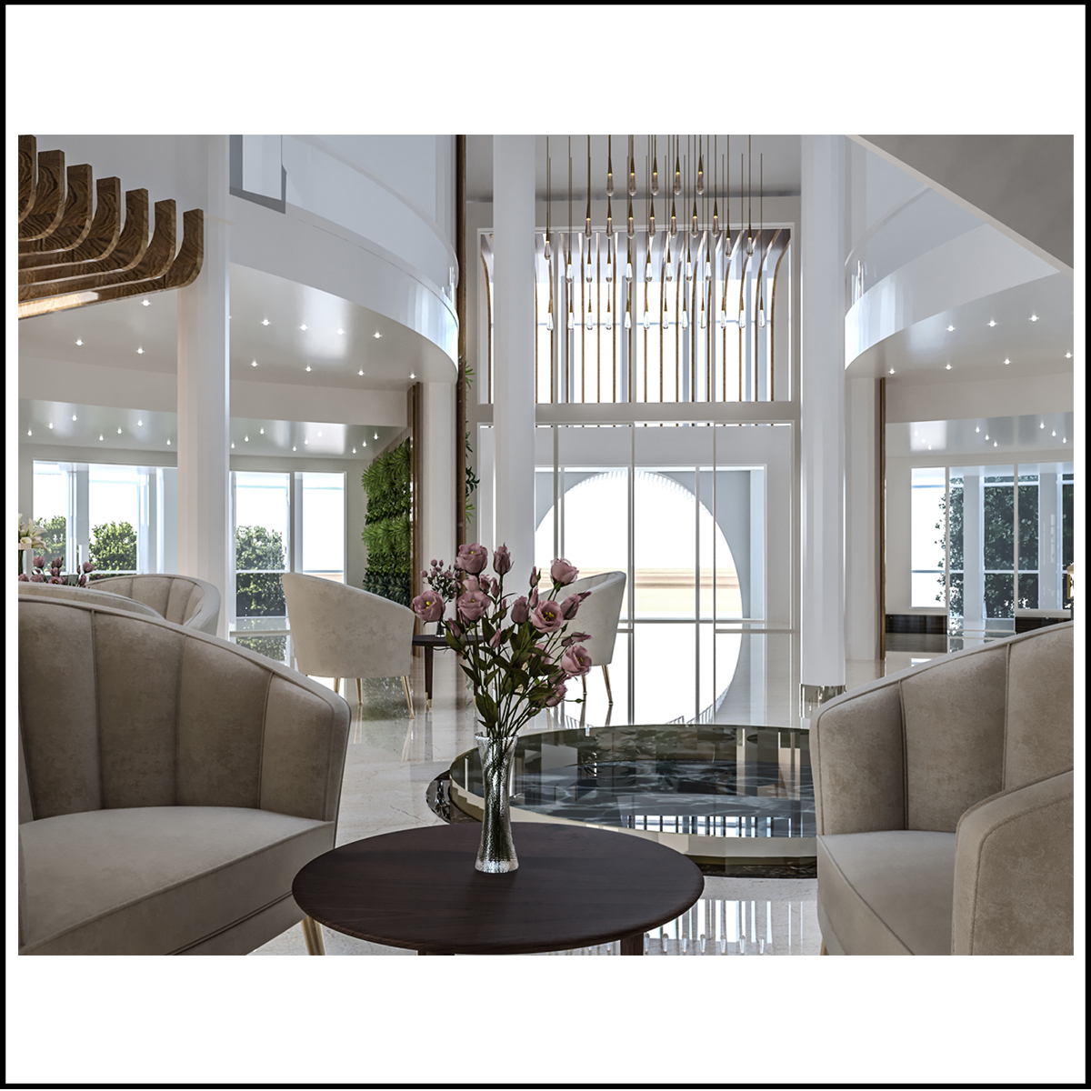 طراحی محوطه به گونه ای بوده که گویی بخشی از ساختمان روی زمین امتداد پیدا کرده و  ساختمان به گونه ای روی حوضچه های آب   جا نمایی شده که انعکاس آن منجر به مرتفع تر دیده شدن  ساختمان می شود .